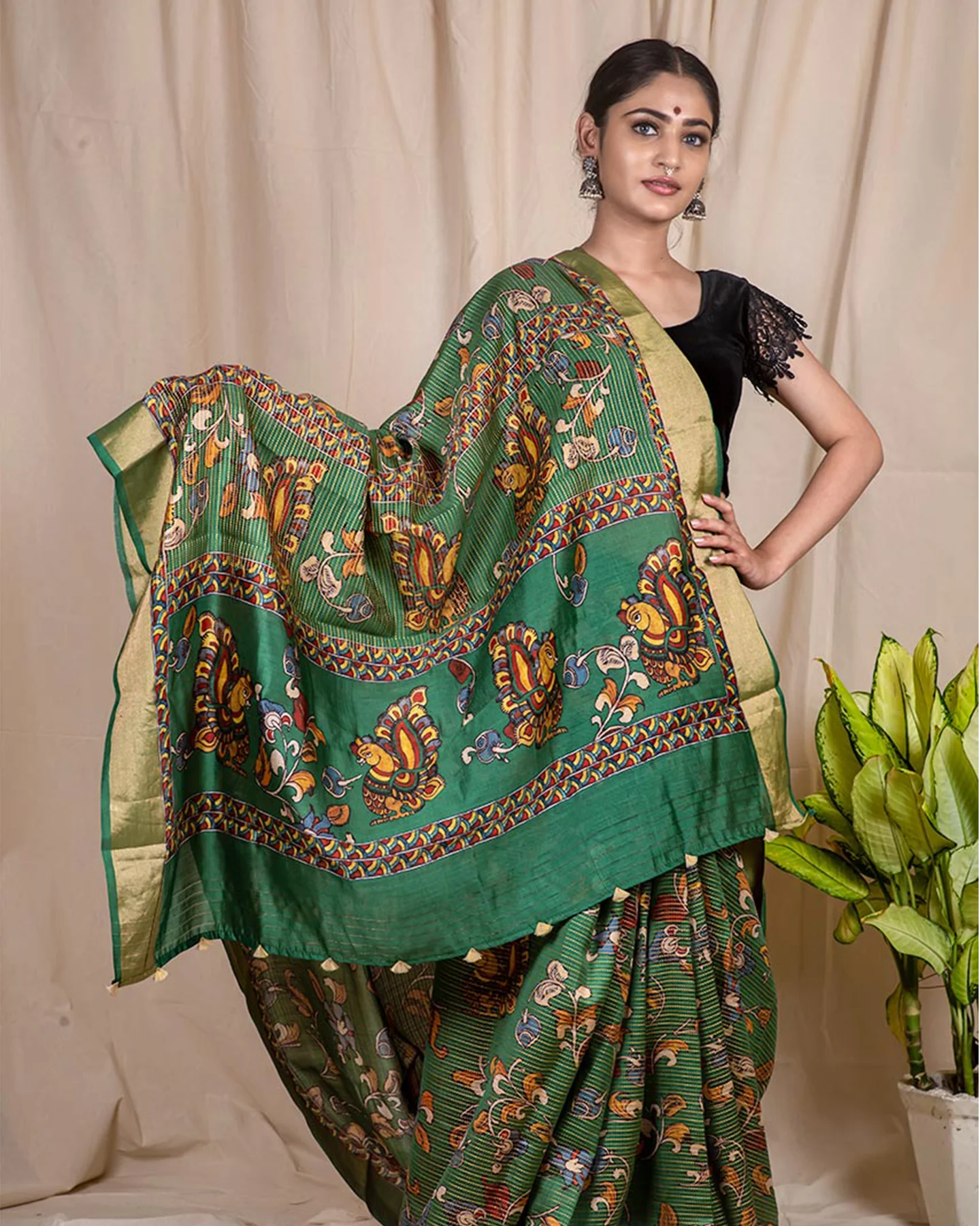 Stand out from the crowd in this exceptional kalamkari saree,melange of animal motifs this saree is a classic,the body has kantha weave an ode to handloom traditions.
